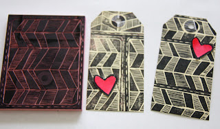 Then we carved a much bigger stamp with a chevron design. Here it is on a couple of tags and I added some stamped hearts from lesson 1. Love it!